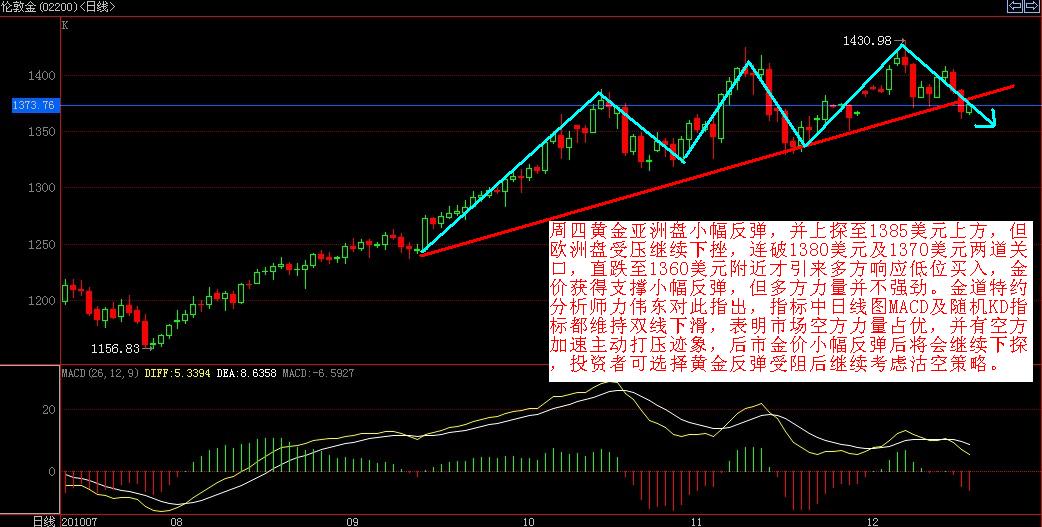 摘要:周四黃金亞洲盤小幅反彈,并上探至1385美元上方,但歐洲盤受壓繼續(xù)下挫,連破1380美元及1370美元兩道關(guān)口,直跌至1360美元附近才引來多方響應(yīng)低位買入,金價獲得支撐小幅反彈,但多方力量并不強勁。金道特約分析師力偉東對此指出,指標中日線圖MACD及隨機KD指標都維持雙線下滑,表明市場空方力量占優(yōu),并有空方加速主動打壓跡象,后市金價小幅反彈后將會繼續(xù)下探,投資者可選擇黃金反彈受阻后繼續(xù)沽空策略。