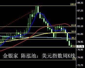 從美指周K線看,已經(jīng)接近0.236(77.50)支撐位,昨天的美國經(jīng)濟數(shù)據(jù),沒有改變美指下跌的趨勢,但是在0.236美指有強支持,估計會有一波反彈,但是本周五的非農,將決定美指是直接跌破支撐位,還是短線反彈。