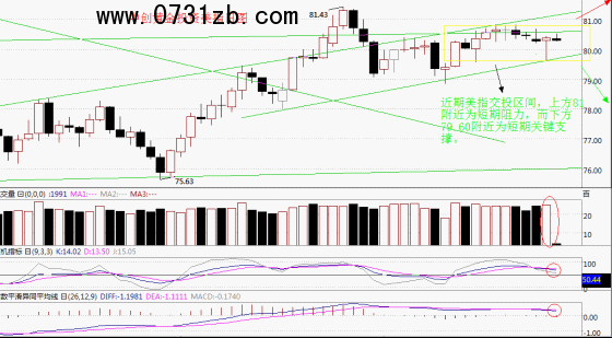 美指近期受到假期影響一直處于79-81區(qū)間內(nèi)盤整。從日圖來看美指兩次下探79.60附近后均迅速回升,且最后均收于80.37附近。而從其他指標(biāo)來看,不管是KDJ還是MACD以及成交量都顯示美指目前短期內(nèi)仍處于強(qiáng)勢區(qū)間中,一旦今日美指守穩(wěn)79.60,那么美指將再次挑戰(zhàn)短期新高82整數(shù)關(guān)口。而這種可能的存在或?qū)?dǎo)致金價出現(xiàn)年關(guān)附近的多單了結(jié),促使金價出現(xiàn)回落。反之將推動金價再次出現(xiàn)漲勢,不過筆者個人認(rèn)為后者的可能性較小。(如下圖)