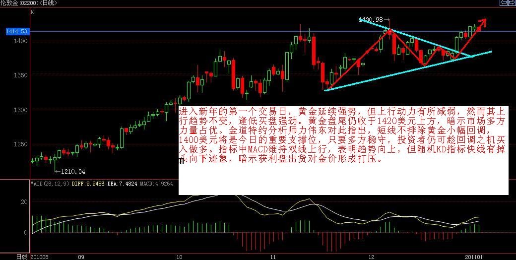進(jìn)入新年的第一個交易日,黃金延續(xù)強勢,但上行動力有所減弱,然而其上行趨勢不變,逢低買盤強勁。黃金盤尾仍收于1420美元上方,暗示市場多方力量占優(yōu)。金道特約分析師力偉東對此指出,南北韓局勢仍然不穩(wěn),韓國總統(tǒng)李明博表示將會強硬回應(yīng)朝鮮可能的挑釁,令市場避險買盤持續(xù)增加,為金價走強帶來支撐。但進(jìn)入紐約盤,美國12月ISM制造業(yè)采購經(jīng)理人指數(shù)連續(xù)三月上升,提振美元指數(shù),削弱了黃金的上行力度。今早黃金小幅低開,但下方買盤較強,料金價回調(diào)獲得支撐后將會繼續(xù)上探,向歷史高位1430美元進(jìn)軍,投資者可趁回調(diào)買入做多。