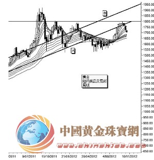 黃金價格一直處于長期上升交易通道中。交易通道的下邊緣趨勢線A開始于2010年1月。交易通道的上邊緣開始于2010年5月。