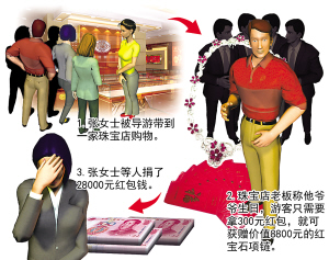 導游領你進到一家珠寶店,老板會很開心地出來說,他的運氣太好了,昨天他的二老婆或者三老婆給他生了雙胞胎,為了表示慶祝,他會免費送給游客一個標價幾千元甚至上萬元的玉鐲,然后告訴你,“咱們中國講究禮尚往來,你給我包個紅包吧,一兩百元就行,寫上祝福的話,討個吉利。”