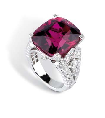卡地亞高級珠寶戒指,在戒托之上鑲嵌著色澤豐潤的珍罕紅寶石,散發(fā)出奪目光芒。
