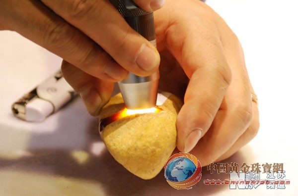 1月7日,一位買家用專業(yè)燈具照射并觀察玉石原石。 |