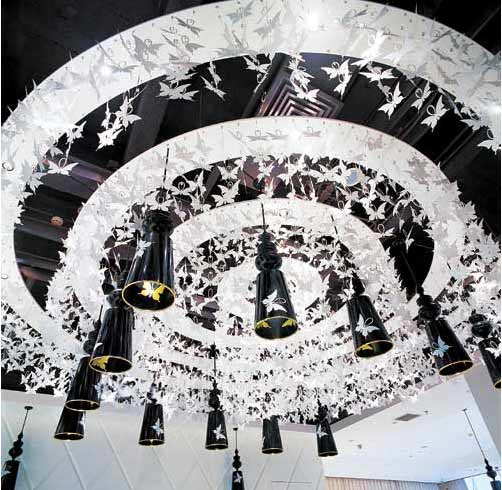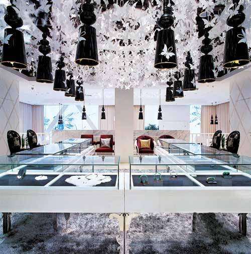在展示空間中,剪紙蝴蝶的裝置、大量家具蝴蝶腿的變形,都滲透著東方的符號和氣息。大幅度的剪紙蝴蝶大面積的懸掛于上空,讓人仿佛置身于夢幻仙境般的童話世界。剪紙材質(zhì)的裝飾物不但不會搶了珠寶的鏡頭,反而使這些天生就堅硬的物品,更顯其經(jīng)久不變的保值價值。另外加上這種環(huán)保的紙質(zhì)的材質(zhì),在當下金融危機的現(xiàn)狀下,低調(diào)的美感更易贏得大眾的喜愛,可謂一舉多得的設(shè)計。