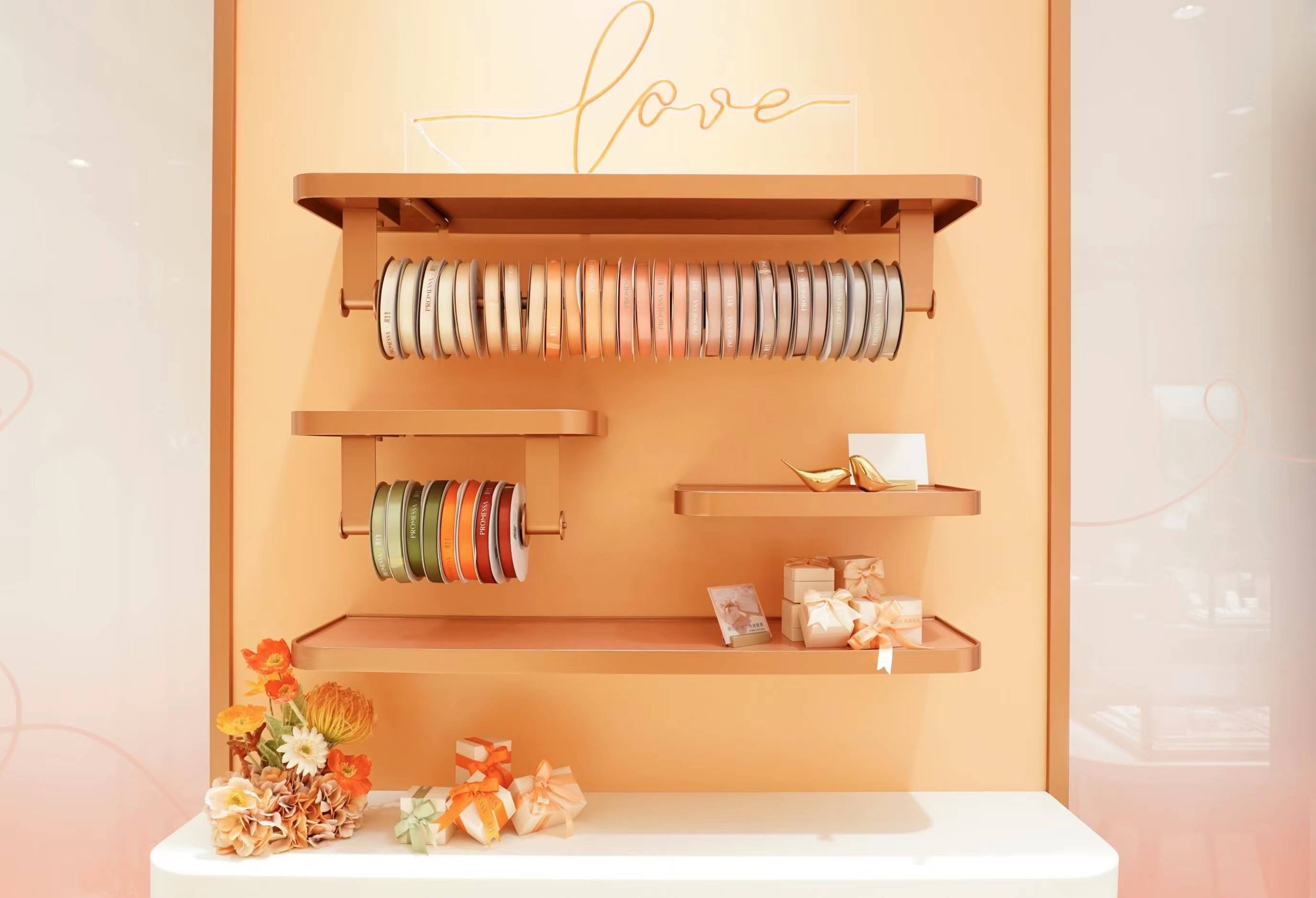 以溫暖時(shí)尚的淡橘色為主調(diào),以玫瑰金及象牙色作點(diǎn)綴,PROMESSA體驗(yàn)店為年輕愛侶營造出浪漫舒適的氛圍。店內(nèi)墻壁加入紅繩及同心結(jié)手繪線條,就像月老為兩人系上紅繩,牽引著走向幸福之門。
