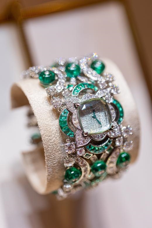維納斯魅影(Emerald Venus)腕表,靈感源于一種名為Capelvenere的地中海蕨類植物,以致敬希臘神話中的美麗女神。這枚計時佳作鑲嵌祖母綠,搭配長階梯型、密鑲與圓形明亮式切割鉆石,由五名工匠大師耗時900小時制作而成。白色18K金表盤鑲嵌薄荷綠碧璽,充分展現(xiàn)了寶格麗對女性優(yōu)雅氣質別致而生動的演繹,帶來令人心動不已的特別感受。