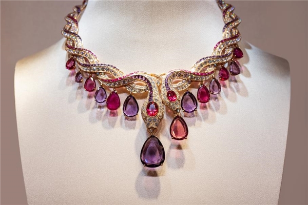 Serpenti花園果實(Serpenti Fruit Garden)項鏈向自然元素及其產生美麗的力量致敬,將羅馬恢弘壯麗的藝術靈感融入創(chuàng)作,以經久不衰的靈蛇展現(xiàn)品牌創(chuàng)意新生、革新不止的創(chuàng)作理念,曼妙曲線與細膩質感釋放閃耀動人的光彩與自然創(chuàng)想。寶格麗大師們歷經1,400多個小時,以匠心工藝打造而成,完美詮釋硬寶石與玫瑰金的融合。充滿活力的粉紅色碧璽、紫水晶和紅碧璽于靈蛇優(yōu)雅纏繞的身姿間輝映交織,彰顯大自然的蓬勃力量與魅力之姿。
