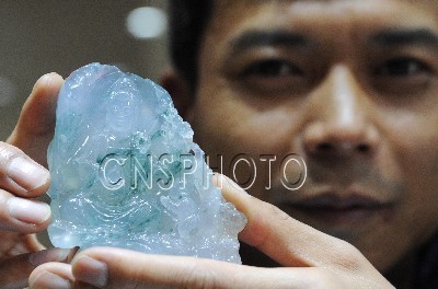 來自云南的翡翠玉雕工藝大師楊樹明在蘇州和基廣場一家珠寶店展示其價值千萬元的一件翡翠玉雕“童子觀音”。