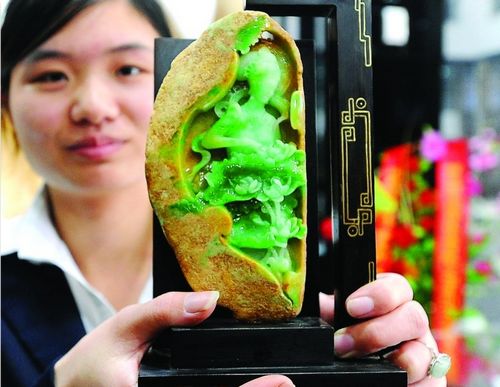 一名蘇州“玉福祥”珠寶連鎖店工作人員展示由云南翡翠玉雕工藝大師楊樹明雕刻的一件名為“瑤池夢繞”的翡翠玉雕。