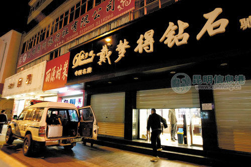 記者李曉靜 李佳健 昨天下午6點,正是華燈初上市民逛街的時間,可楚雄市鹿城西路戴夢得鉆石店卻卷簾門緊閉。透過虛掩的后門能看見,民警們正戴著腳套在里面取證。