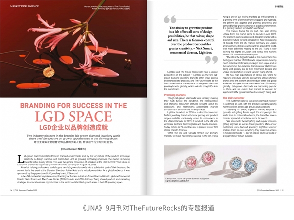 8月由JNA(Jewellery News?。粒螅椋幔┙M織籌辦的實(shí)驗(yàn)室培育鉆石峰會(huì)(Lab-Grown?。模椋幔恚铮睿洹。樱酰恚恚椋簦┰谏钲谂e行。作為珠寶行業(yè)的頂級(jí)機(jī)構(gòu),JNA所籌辦的本次峰會(huì)聚焦培育鉆石領(lǐng)域,并邀請(qǐng)了該領(lǐng)域眾多領(lǐng)軍人物和具有影響力的珠寶品牌。TheFutureRocks品牌CEO Anthony?。裕螅幔睿缡苎鳛檠葜v人參與了本次峰會(huì),與到場(chǎng)者分享和探討關(guān)于培育鉆石的市場(chǎng)經(jīng)驗(yàn)與未來(lái)前景。作為本次峰會(huì)的主要受邀品牌,TheFutureRocks還登上了JNA雜志9月刊,并在全球范圍內(nèi)發(fā)行。
