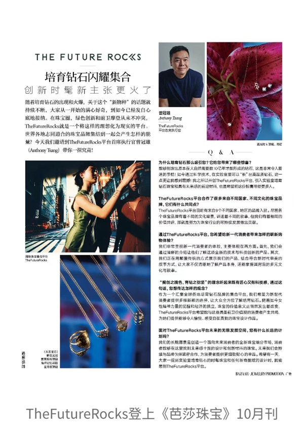10月品牌創(chuàng)始人兼CEO?。粒睿簦瑁铮睿。裕螅幔睿缃邮芰藭r(shí)尚傳媒集團(tuán)旗下中國(guó)第一本高級(jí)珠寶時(shí)尚雜志《芭莎珠寶BAZAAR?。剩澹鳎澹欤颍返膶TL。作為品牌在大陸市場(chǎng)的首次媒體亮相,Anthony詳細(xì)的向讀者介紹了TheFutureRocks,及對(duì)于中國(guó)市場(chǎng)的長(zhǎng)遠(yuǎn)規(guī)劃。