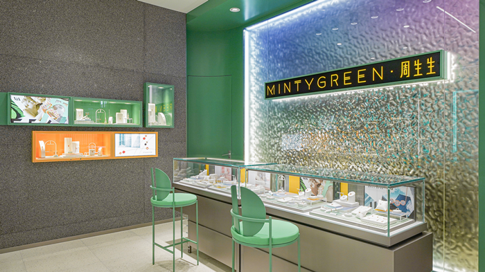 位于廣州市海珠區(qū)琶洲商場的全新形象店,是MINTYGREEN·周生生為年輕一代打造的“Z”夢工廠,裝修上大面積采用了金屬設(shè)計,力求營造層次豐富的質(zhì)感空間、為進店的消費者帶來沉浸式的多維度感官體驗。