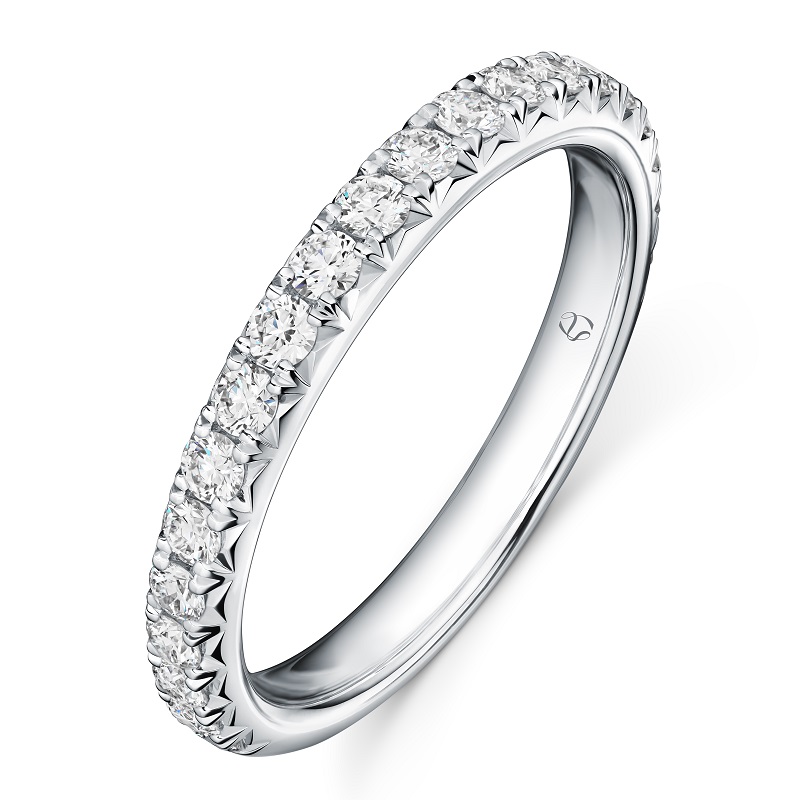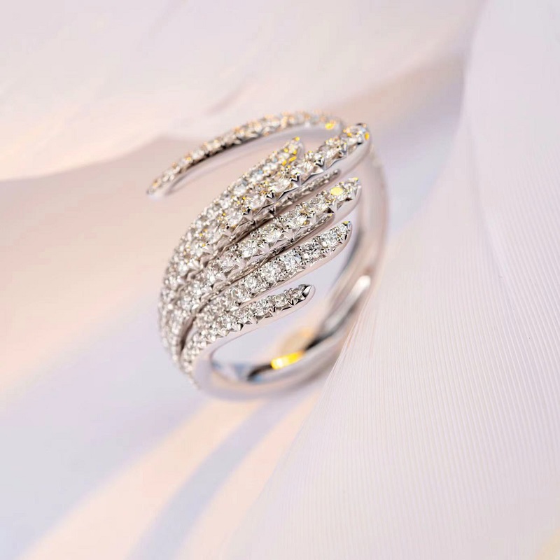 法式切割密鑲是系列的主要鑲嵌工藝,這種又稱為「魚尾鑲嵌」的技巧對(duì)工藝非常講究,所需的時(shí)間為傳統(tǒng)密鑲設(shè)計(jì)的四倍,紋理細(xì)致,緊貼鉆石的金屬雕琢出深V形琢面。這種精致復(fù)雜的琢面與Hearts On Fire的特色車工相輔相成,使光線能在鉆石內(nèi)充分折射,綻放迷人的光芒和火彩。