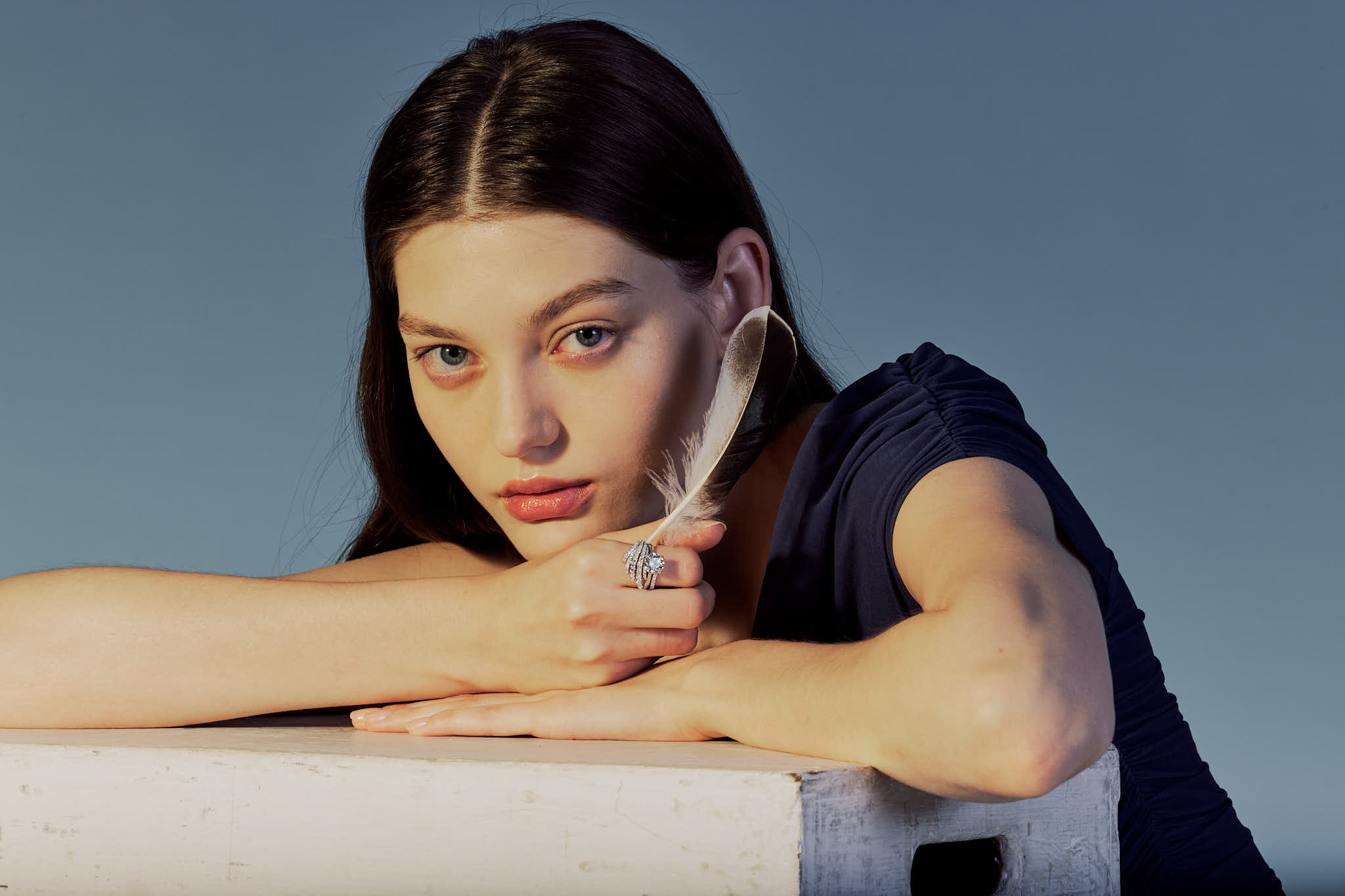 除了鉆石戒指,VELA系列的焦點(diǎn)款式亦包括一款形似羽毛的密鑲鉆戒,溫柔地圍繞纖纖玉指,亦可疊搭單鉆戒指,將簡約的單顆鉆石戒指變成奪目不凡的設(shè)計(jì)。一款精致造型的項(xiàng)鏈,猶如兩條交錯(cuò)的羽毛,象征兩顆相牽的心。另有一對(duì)絢麗搖曳的耳環(huán),則以優(yōu)美的姿態(tài)攀緣耳際,靈動(dòng)美鉆隨著舉手投足綻放動(dòng)人光芒。