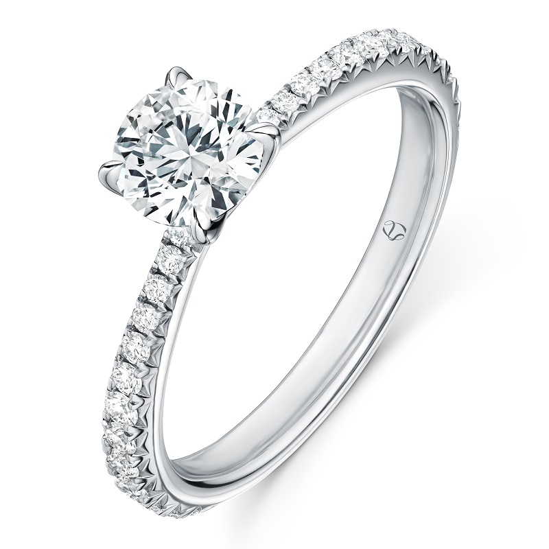 VELA Halo訂婚戒指以法式切割密鑲鉆石勾勒唯美光環(huán),并延伸至優(yōu)美的環(huán)圈。襯鉆以微斜的角度鑲嵌,使Hearts On Fire主鉆看起來更耀眼璀璨,令人驚艷。