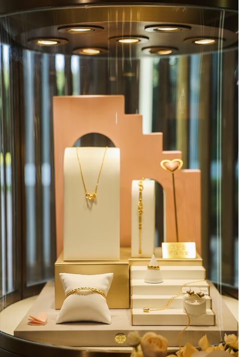 " 心花怒放 " 鎏彩項(xiàng)鏈與手飾,以鎏金工藝點(diǎn)綴綻放的花瓣截面,紅金相映彰顯華麗典雅的精致美感,如心之花綻,在愛與陪伴中展現(xiàn)愛滿心間的甜蜜與幸福。" 幸?;ㄩ_ " 小套系以盛開的花瓣形狀結(jié)合線條紋理圖案,傾繹當(dāng)代女性的優(yōu)雅氣質(zhì),亦彰顯自信從容的幸福光彩,溫柔知性襯托氣場(chǎng),簡(jiǎn)約設(shè)計(jì)更顯摩登型格。" 花好悅圓 " 小套系,巧致玲瓏的造型結(jié)合生動(dòng)舒展的線條,具象展現(xiàn)了 " 花好月圓 " 的東方生活美學(xué),以花綻姿態(tài),傾訴與對(duì)幸福人生的美好祝愿,更為日常的清麗雅致增繪一抹意趣。" 出水芙蓉 " 小套系,馥郁花間抒寫繾綣情深,點(diǎn)鉆煥耀暉芒熠熠,如一朵尚帶露珠的清晨花瓣,呈現(xiàn)出清新自然的優(yōu)雅氣質(zhì)。