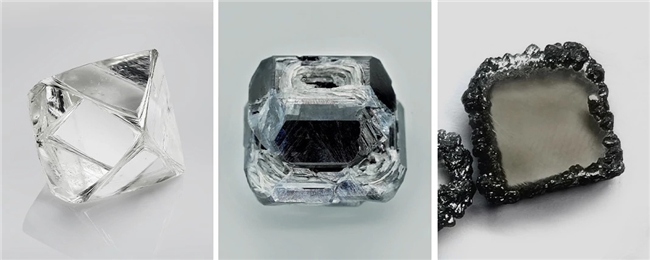 從左至右:天然鉆石原石、HPHT培育鉆石原石、CVD培育鉆石原石