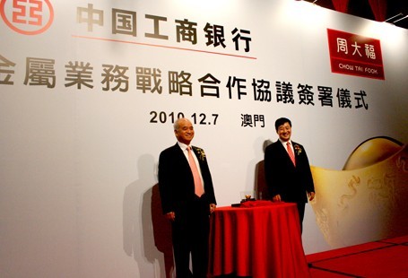 2010年12月7日,周大福與中國工商銀行在澳門簽署協(xié)議結(jié)成戰(zhàn)略合作關(guān)系。作為戰(zhàn)略合作的第一步,即首度實(shí)現(xiàn)著名珠寶零售品牌與大型商業(yè)銀行的貴金屬業(yè)務(wù)的合作。在發(fā)布會現(xiàn)場也由周大福集團(tuán)董事總經(jīng)理鄭家純博士及中國工商銀行副行長張紅力先生共同為“如意金元寶”產(chǎn)品揭幕。此次開發(fā)的實(shí)物黃金、白銀元寶零售業(yè)務(wù),在工商銀行內(nèi)地及海外網(wǎng)點(diǎn)同步發(fā)行。