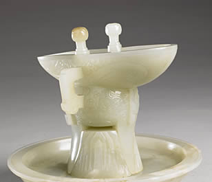 爵杯仿自商周青銅爵,所飾紋飾也多出自古彝器,但其下所具的托盤具有清代特點(diǎn)。清乾隆時(shí)期,在玉器、瓷器、琺瑯等多種手工藝品中都可見到此種形制的仿古爵杯。